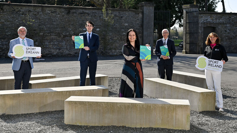 Sport Ireland publishes the Anti Doping Review 2020: Pictured at the announcement are Minister for Media, Tourism, Arts, Culture, Sport and the Gaeltacht, Catherine Martin TD, and Minister of State for Sport and the Gaeltacht Jack Chambers TD, with, from left, Chairman of Sport Ireland Kieran Mulvey, Sport Ireland Chief Executive John Treacy, Sport Ireland Director of Participation & Ethics Dr Una May. Photo by Brendan Moran/Sportsfile