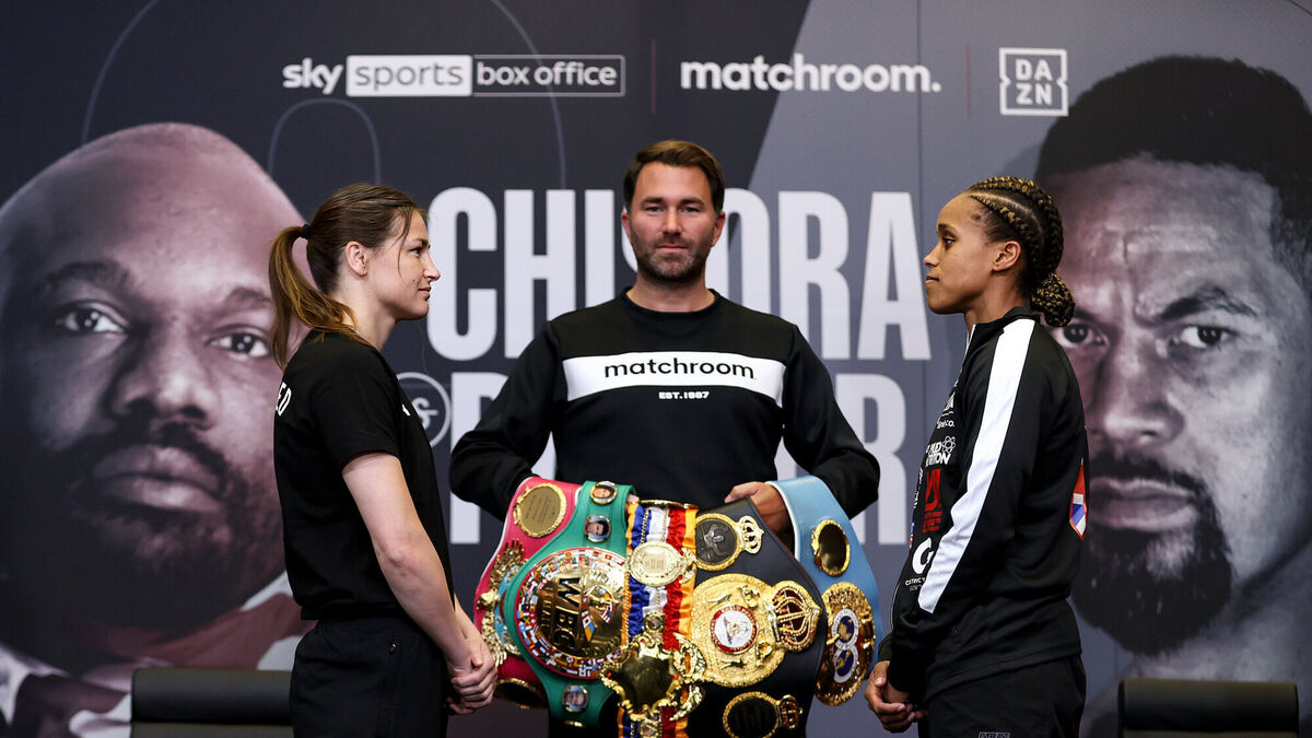 Katie Taylor and Natasha Jonas square off, in the company of promoter Eddie Hearn, during a press conference at the Matchroom Boxing fight hotel in Manchester, ahead of their WBC, WBA, IBF and WBO female lightweight title fight on Saturday night. Picture: Mark Robinson