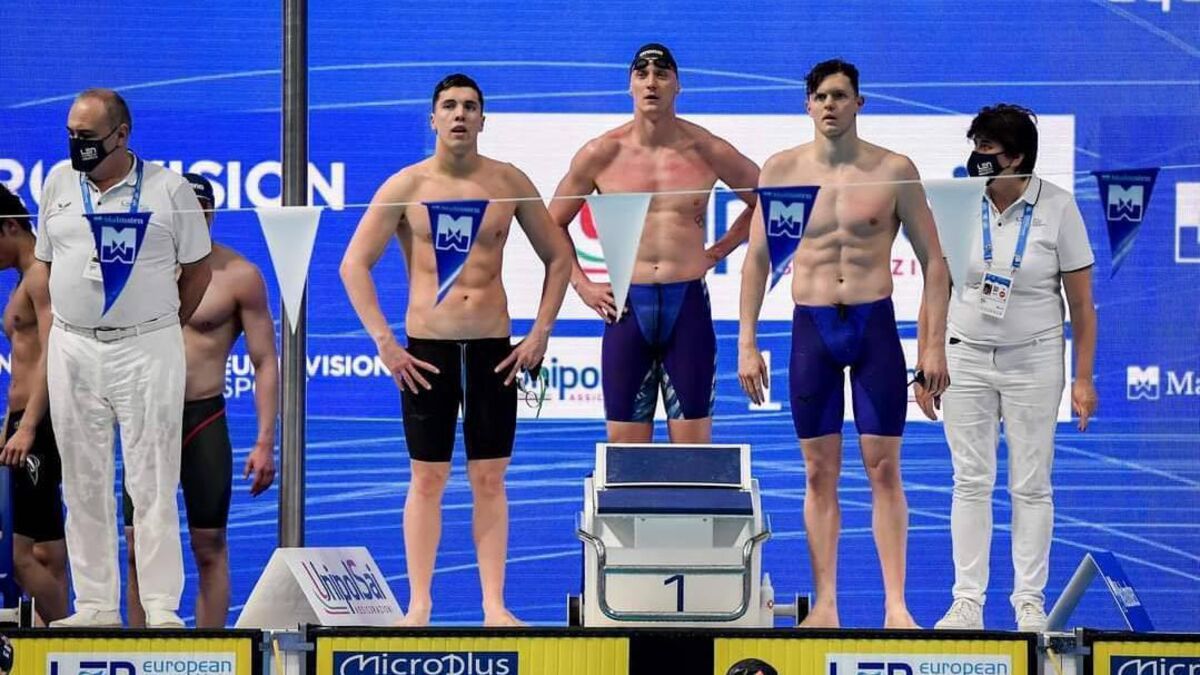 The Irish men's 4x100m medey relay: Darragh Greene, Shane Ryan, Brendan Hyland and Jack McMillan (in water) placed seventh at the European Championships, Budapest, May 2021. Their Irish record time 7:34.62 secured Olympic qualification. Picture: Swim Ireland.