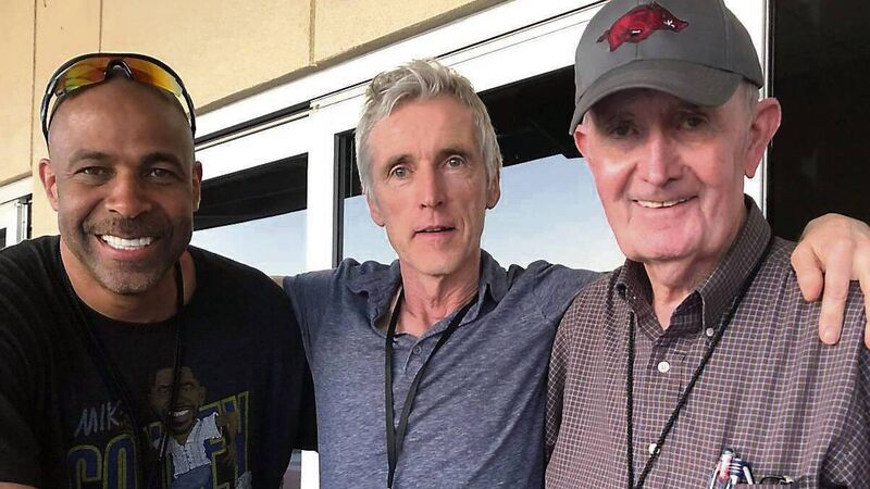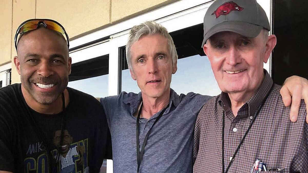 INSPIRING THE GENERATIONS: 1992 Olympic triple jump gold medal winner Mike Conley (left) with Frank O’Mara and John McDonnell, the legendary former University of Arkansas cross country and track and field coach. McDonnell, who hailed from Mayo, died this week.