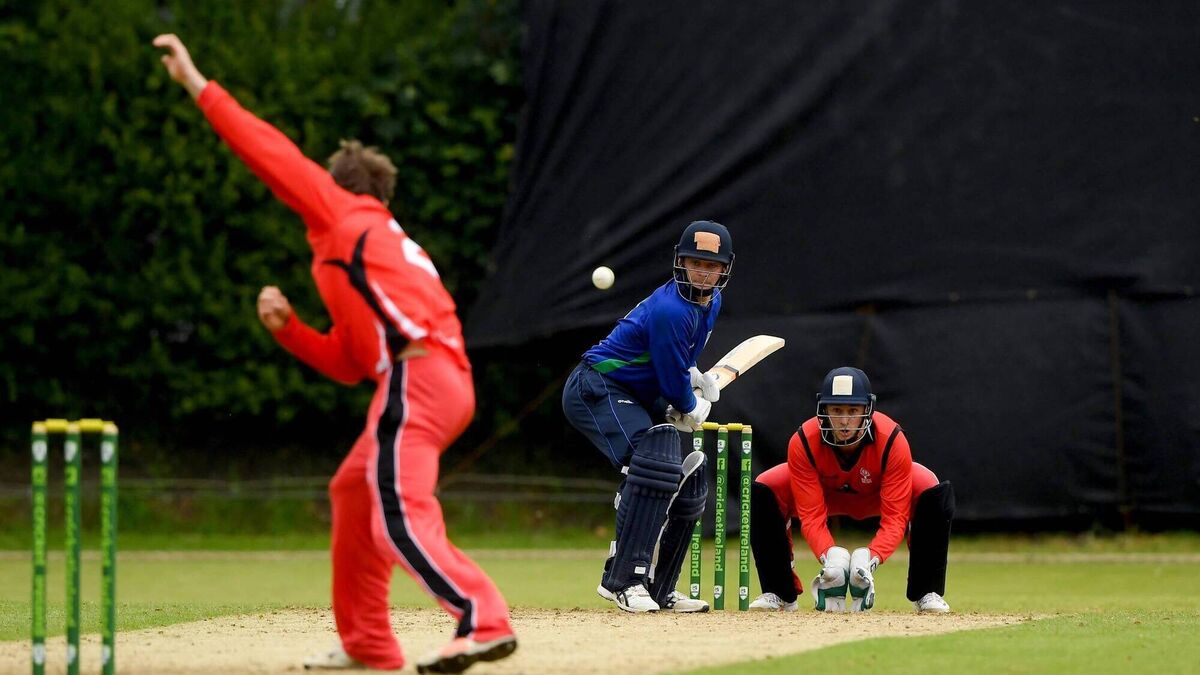 William Porterfield of North West Warriors plays a bowl from Matt Ford of Munster Reds during the Cricket Ireland Inter-Provincial Cup 2021 match at The Mardyke. Picture: Matt Browne/Sportsfile