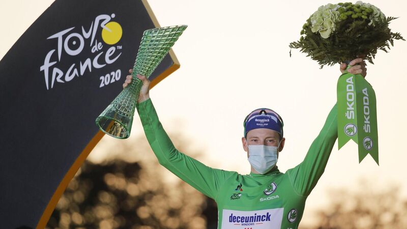 Sam Bennett of Ireland, wearing the best sprinter's green jersey, celebrates on the podium after the twenty-first and last stage of the Tour de France cycling race over 122 kilometers (75.8 miles), from Mantes-la-Jolie to Paris, France, Sunday, Sept. 20, 2020. (AP Photo/Christophe Ena)