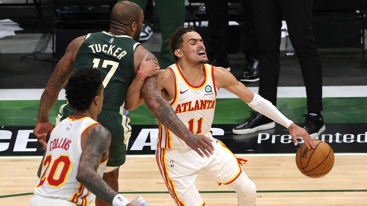 YOUNG GUN: Atlanta's Trae Young is fouled by P.J. Tucker of the Milwaukee Bucks in Game One of the Eastern Conference Finals in Milwaukee.Â