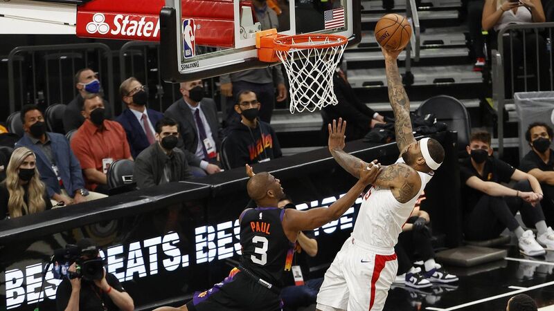 DeMarcus Cousins of the LA Clippers attempts a shot against Chris Paul of the Phoenix Suns in Game Five of the Western Conference finals at Phoenix Suns Arena.