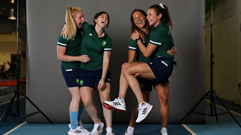 Ayeisha McFerran, Roisin Upton, Lena Tice, and Deirdre Duke pictured on the day they collected their Olympic kit. Photo by Brendan Moran/Sportsfile