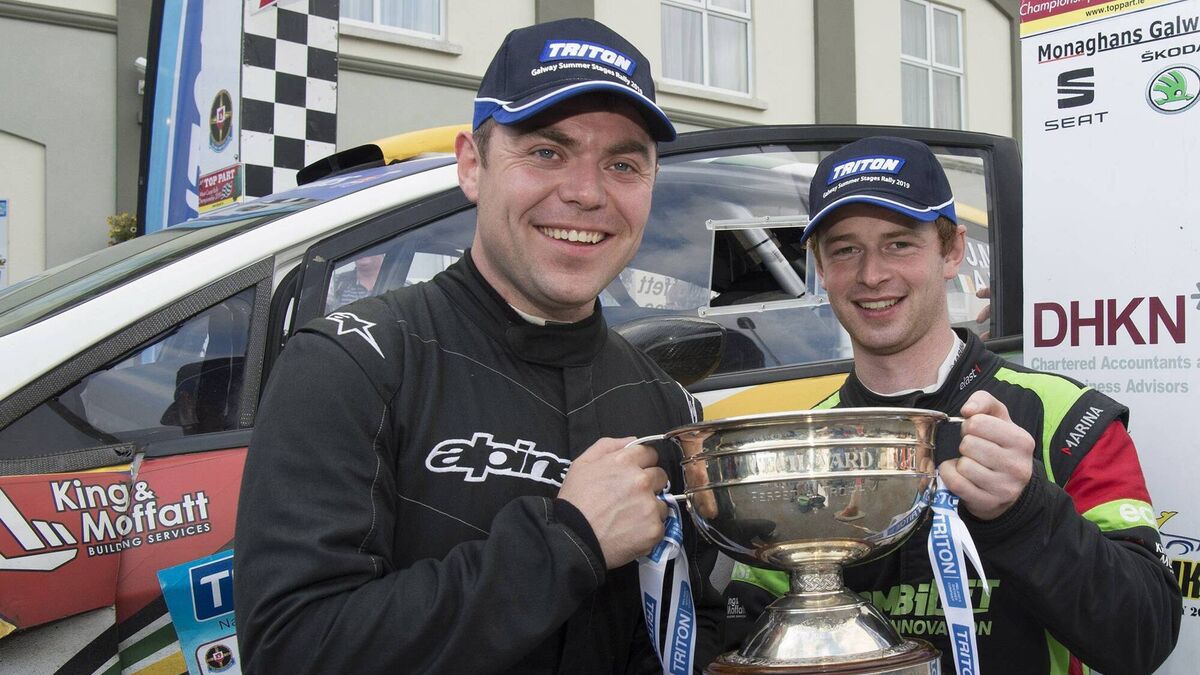 File pic of Monaghan’s Josh Moffett (right) and his Wexford co-driver Andy Hayes