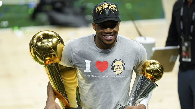 Milwaukee Bucks forward Giannis Antetokounmpo smiles while holding the NBA Championship trophy, left, and Most Valuable Player trophy after defeating the Phoenix Suns in Game 6 of basketball's NBA Finals. Picture: AP Photo/Paul Sancya