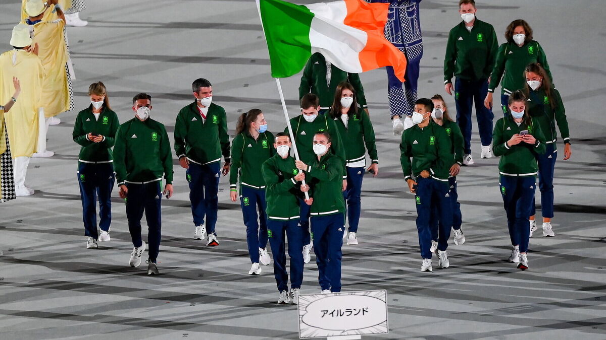 Team Ireland flagbearers Kellie Harrington, right, and Brendan Irvine carry the tri-colour during the 2020 Tokyo Summer Olympic Games opening ceremony. Picture: Stephen McCarthy/Sportsfile