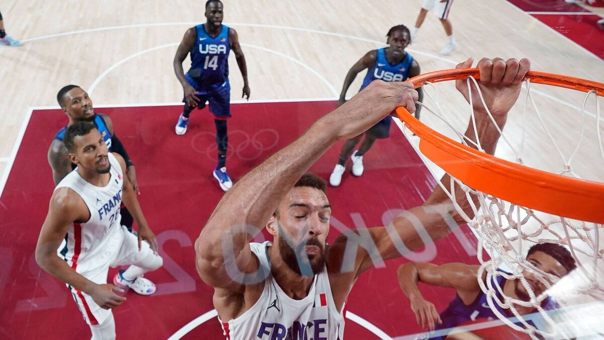 France’s Rudy Gobert dunks on USA in their clash at the Saitama Super Arena yesterday. Picture: Eric Gay/Getty Images