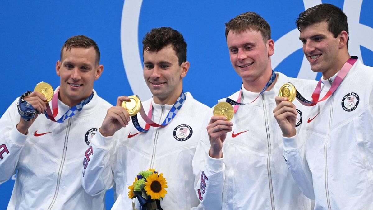 Caeleb Dressel, Blake Pieroni, Bowen Becker and Zach Apple pose with their medals after the final of the men's 4x100m freestyle relay swimming event.