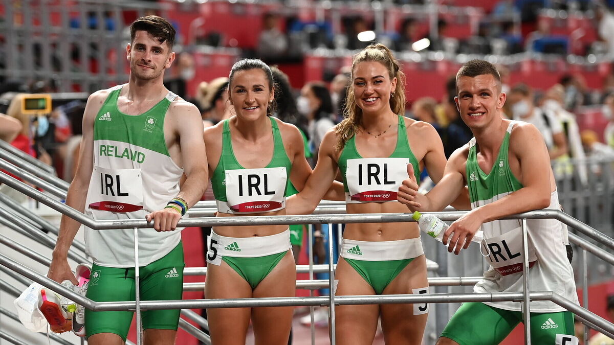 The Ireland 4x400 mixed relay team, from left, Cillin Greene, Phil Healy, Sophie Becker, and Christopher O’Donnell after their heat at the Olympic Stadium. Picture: Stephen McCarthy
