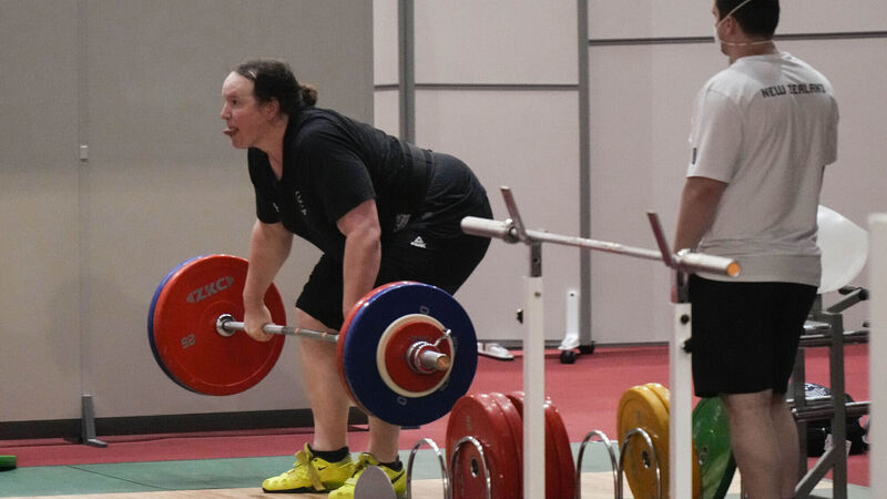Laurel Hubbard of New Zealand practices, at the 2020 Summer Olympics. Picture: AP Photo/Luca Bruno