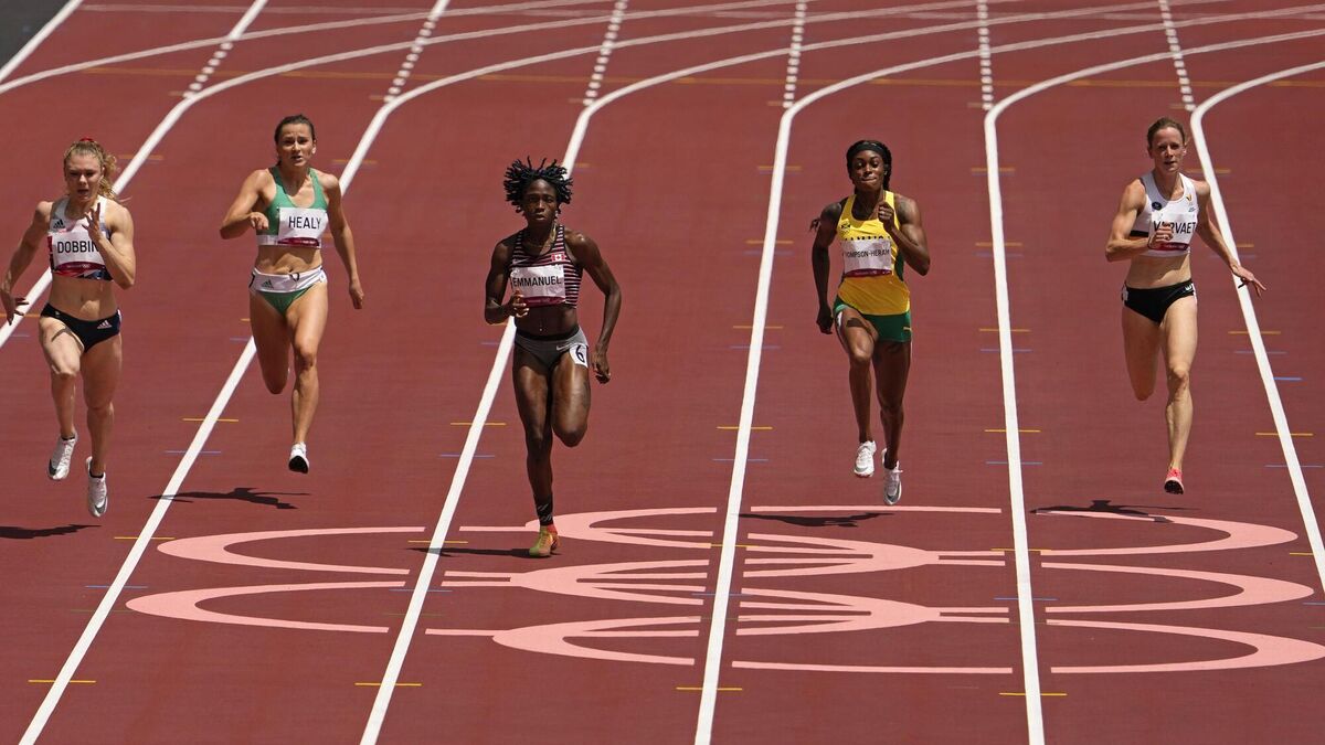 Beth Dobbin, of Britain, Phil Healy, of Ireland, Crystal Emmanuel, of Canada, Elaine Thompson-Herah, of Jamaica and Imke Vervaet, of Belgium, from left, compete in a women's 200-meter first round heat at the 2020 Summer Olympics, Monday, Aug. 2, 2021, in Tokyo, Japan. (AP Photo/Charlie Riedel)