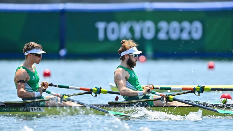 Fintan McCarthy, left, and Paul O'Donovan of Ireland in action during the heats of the Lightweight Men's Double Sculls at the Tokyo Olympics.
