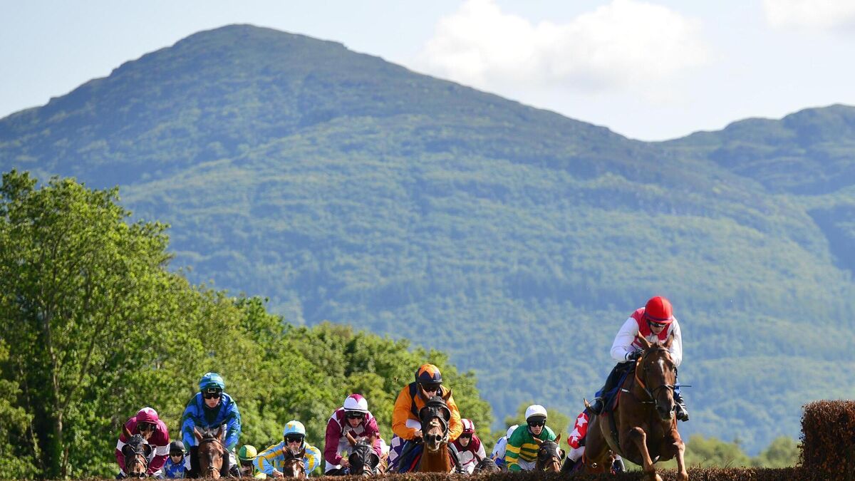 A general view of the racetrack with Torc & Mangerton Mountains in the background as runners and riders clear the 4th fence on the final day of the 5 day July Featival meeting.