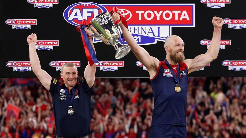 PERTH, AUSTRALIA - SEPTEMBER 25: Simon Goodwin, Senior Coach of the Demons and Max Gawn of the Demons hold the cup aloft during the 2021 Toyota AFL Grand Final match between the Melbourne Demons and the Western Bulldogs at Optus Stadium on September 25, 2021 in Perth, Australia. (Photo by Michael Willson/AFL Photos via Getty Images)
