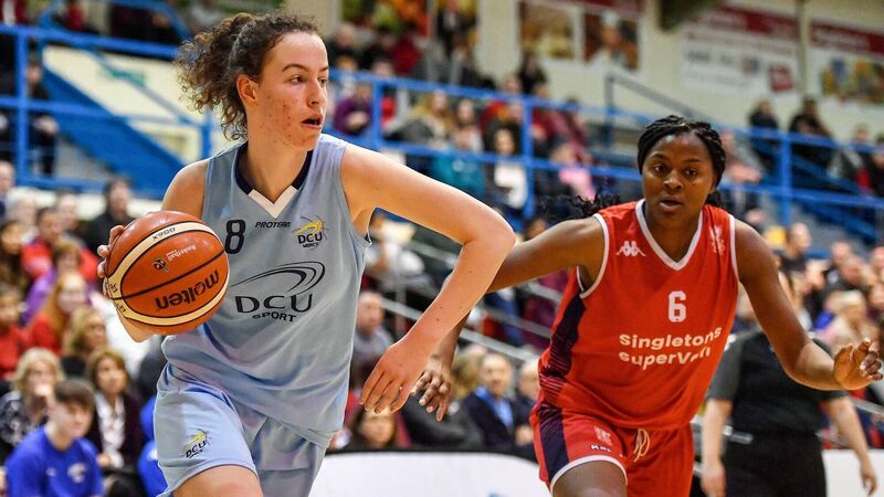DCU Mercy’s Rachel Huijsdens looks to get by Aryn McClure of Singleton Supervalu Brunell during the Hula Hoops Women’s National Cup semi-final.