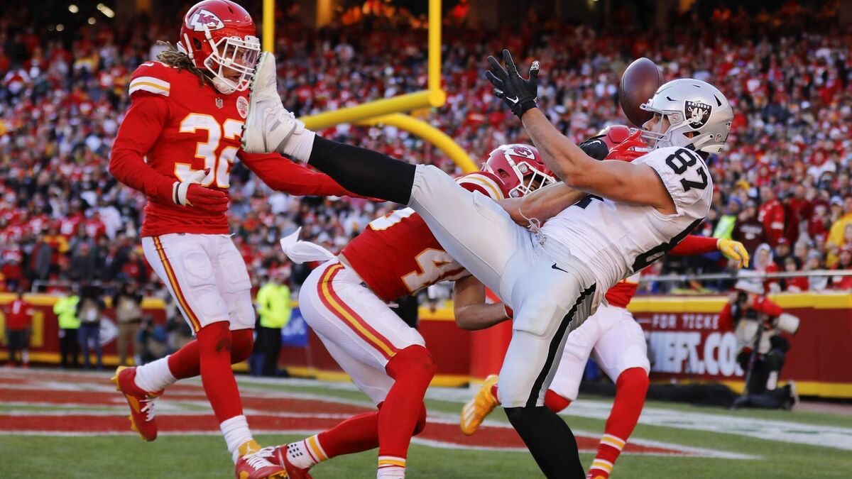 RED ZONE: The Chiefs' Daniel Sorensen breaks up a pass intended for Foster Moreau (87) of the Las Vegas Raiders at Arrowhead Stadium on Sunday. Pic: David Eulitt, Getty Images)
