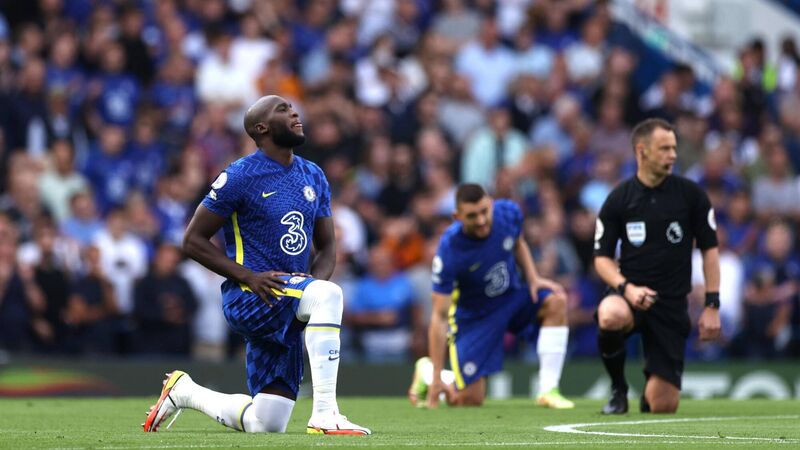 LONDON, ENGLAND - SEPTEMBER 11: Romelu Lukaku of Chelsea takes a knee in support of the Black Lives Matter movement prior to the Premier League match between Chelsea and Aston Villa at Stamford Bridge on September 11, 2021 in London, England. (Photo by Eddie Keogh/Getty Images)