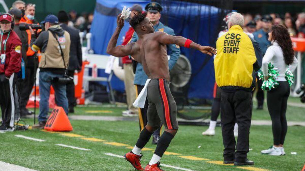 Brownâs mid-game meltdown came late in the third quarter with Tampa Bay trailing 24-10. He appeared animated while talking to Mike Evans, who tried to calm his teammate. But Brown stripped off his pads, jersey, gloves and T-shirt â tossing the gloves and T-shirt into the stands â and then walked bare-chested down the sideline and into the end zone. He then waved to fans as jogged through the end zone and into the tunnel at MetLife Stadium.