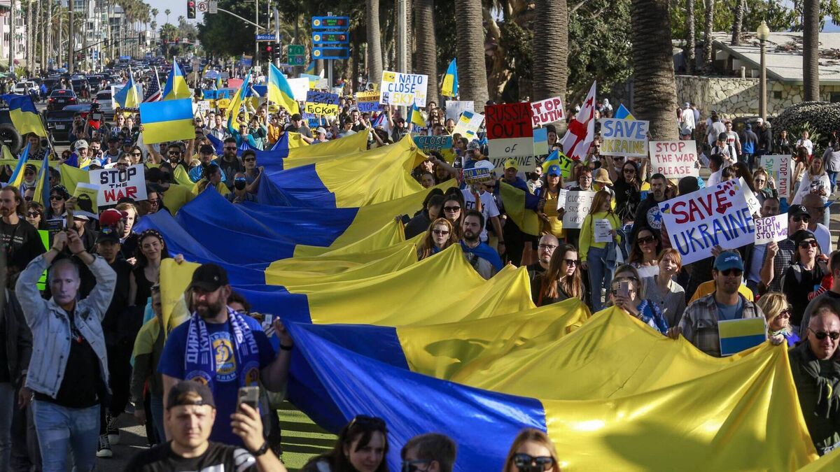 Demonstrators march during a rally in support of Ukraine, in Santa Monica, California