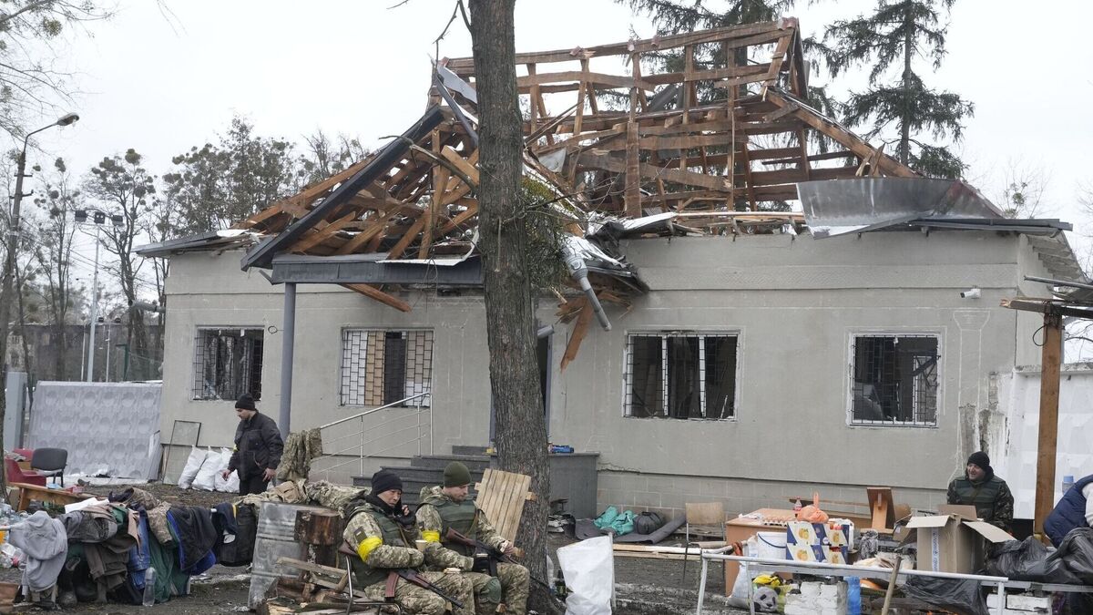 Ukrainian servicemen sit in front of a damaged house near a checkpoint in Brovary, outside Kyiv, Ukraine