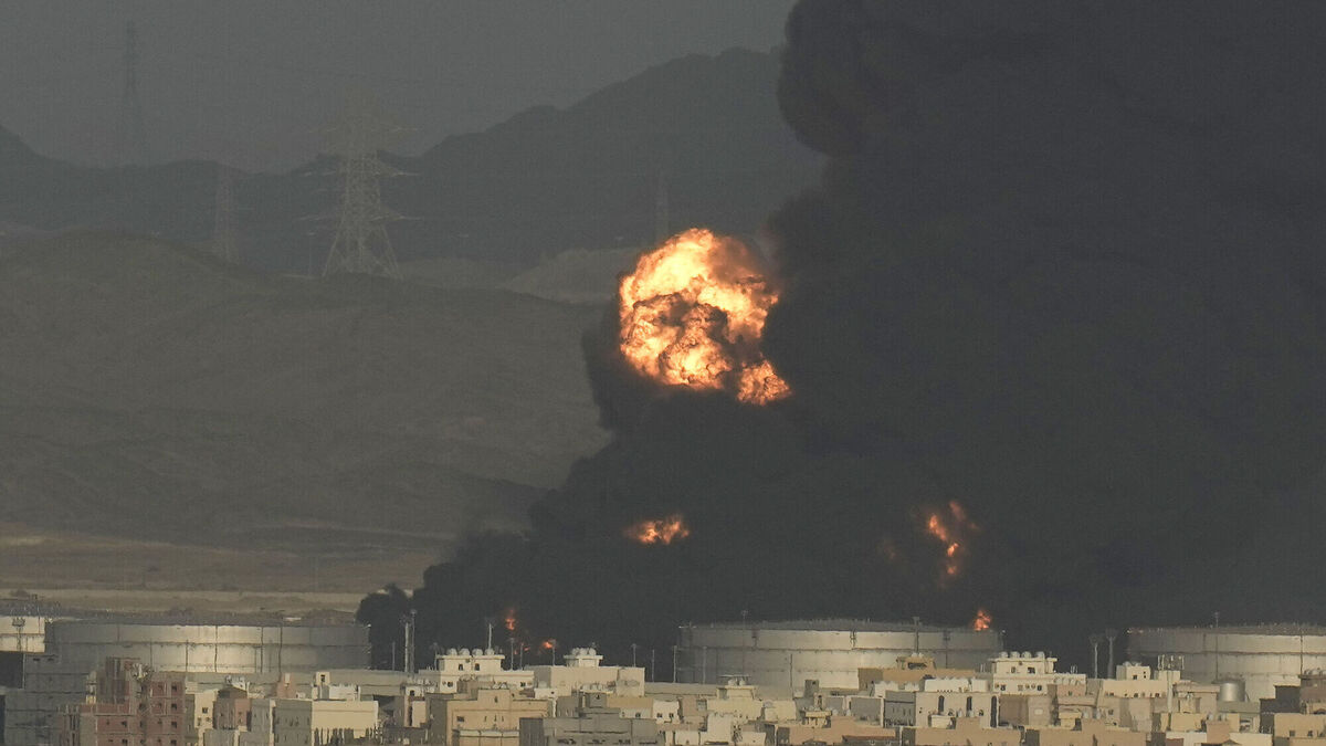Aramco attack: A cloud of smoke rises from a burning oil depot in Jeddah, Saudi Arabia Friday. Picture: Hassan Ammar/AP