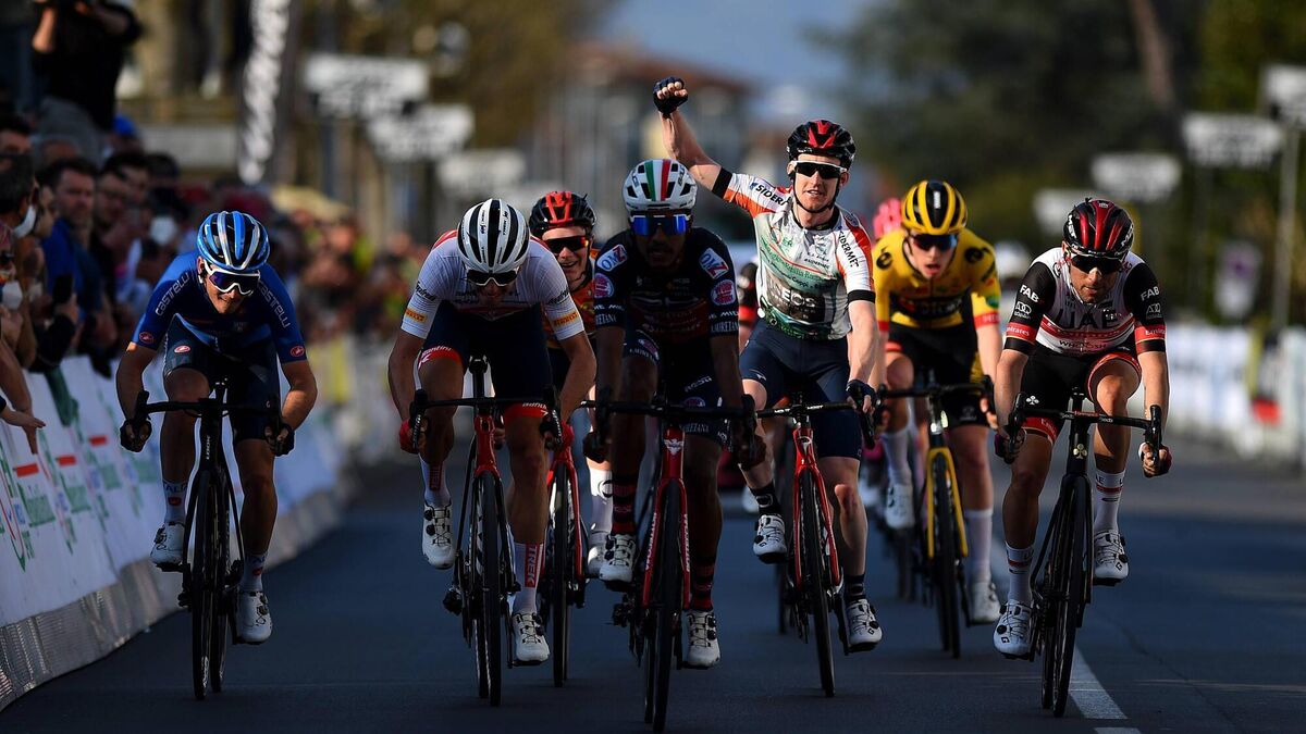 Eddie Dunbar celebrates winning the 36th Settimana Internazionale Coppi e Bartali in Cantagrillo, Italy.Â