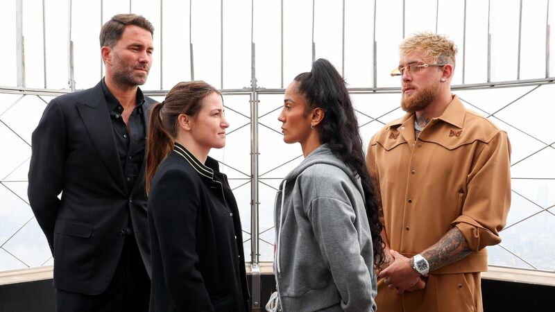 Stare down before the throw down: Promoters Eddie Hearn, left, and Jake Paul with boxers Katie Taylor, left, and Amanda Serrano at the Empire State Building in New York ahead of their WBA, WBC, IBF, WBO and The Ring lightweight title bout at Madison Square Garden on Saturday night. Photo: Ed Mulholland/ Matchroom Boxing via Sportsfile