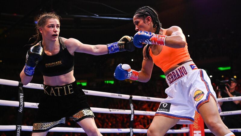 All about the angles: Katie Taylor, left, and Amanda Serrano size each other up during their undisputed world lightweight championship fight at Madison Square Garden. Pic: Stephen McCarthy/Sportsfile