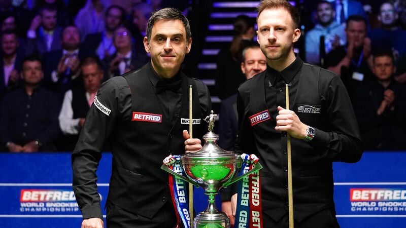 Ronnie O'Sullivan and Judd Trump (right) during day sixteen of the Betfred World Snooker Championship at The Crucible, Sheffield. Picture date: Sunday May 1, 2022.