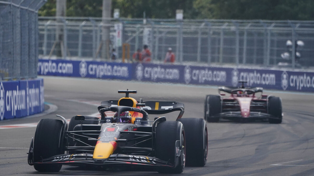 Red Bull driver Max Verstappen of the Netherlands leads Ferrari driver Charles Leclerc of Monaco during the Formula One Miami Grand Prix auto race at the Miami International Autodrome in Miami Gardens.. (AP Photo/Wilfredo Lee)