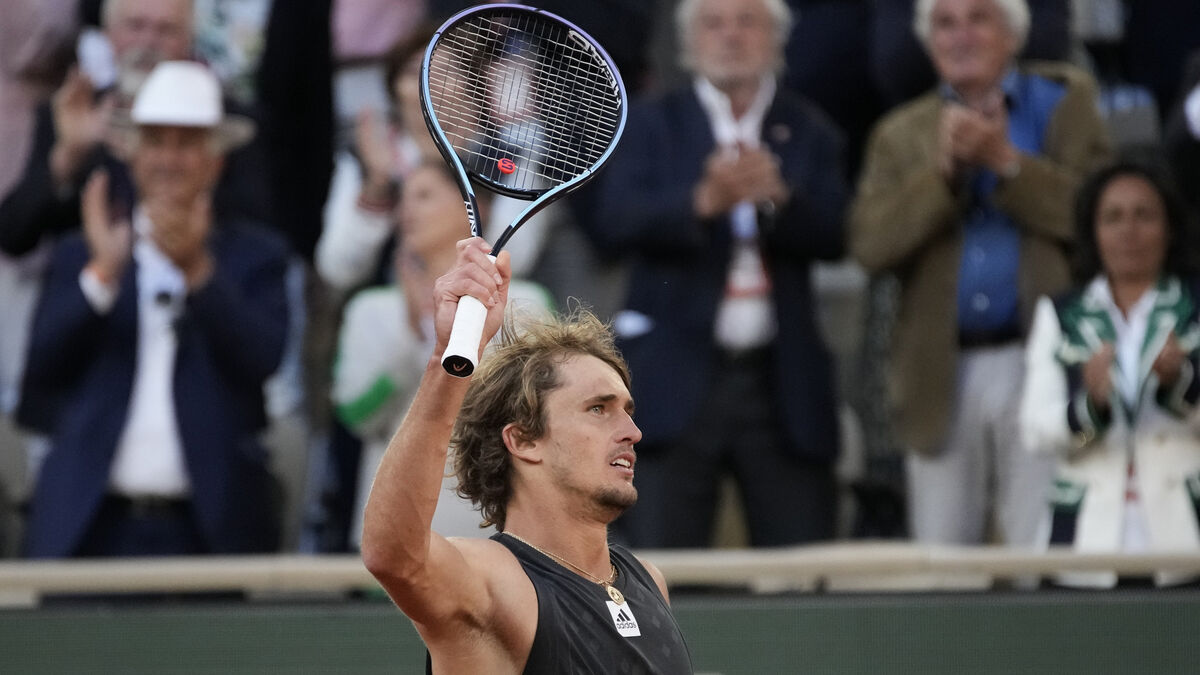 Germany's Alexander Zverev celebrates winning his quarterfinal match against Spain's Carlos Alcaraz in four sets, 6-4, 6-4, 4-6, 7-6 (9-7), at the French Open tennis tournament in Roland Garros stadium in Paris, France, Tuesday, May 31, 2022. (AP Photo/Christophe Ena)
