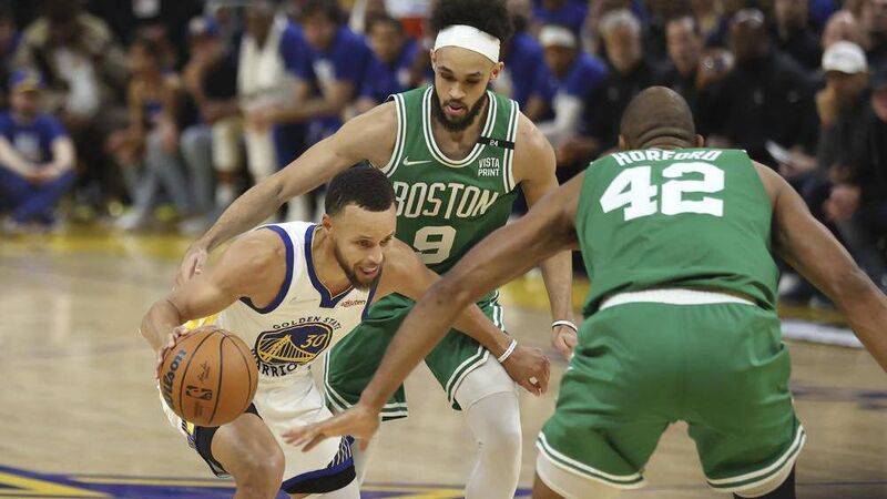 Golden State Warriors guard Stephen Curry is defended by Boston Celtics Al Horford (42) and guard Derrick White (9) in Game 1 of basketball's NBA Finals in San Francisco late Thursday.