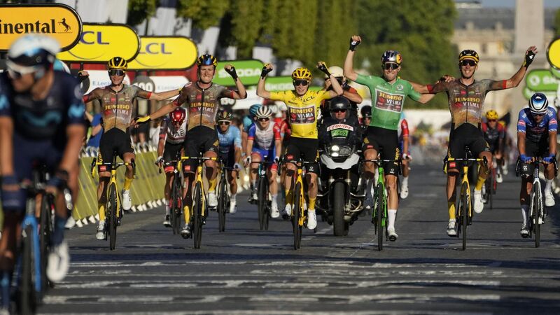 YELLOW FEVER: Tour de France winner Jonas Vingegaard and teammates including Belgium's Wout Van Aert, wearing the best sprinter's green jersey.