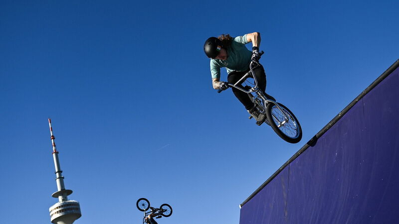 CATCHING AIR: Ryan Henderson of Ireland, right, practices on the BMX Track at Olympiaberg before the European Championships 2022 in Munich, Germany. Pic: David Fitzgerald/Sportsfile
