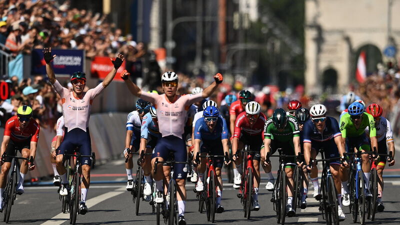 SO CLOSE: Sam Bennett of Ireland crosses the line in fifth place as Fabio Jakobsen of Netherlands celebrates winning during the 28th UEC Road Cycling European Championships during day 4 of the European Championships 2022 in Munich, Germany. Pic: David Fitzgerald/Sportsfile