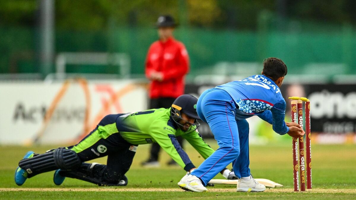 OUT: Simi Singh of Ireland is run out by Azmatullah Omarzai of Afghanistan during the Men's T20 International match between Ireland and Afghanistan at Stormont in Belfast. Pic: Ramsey Cardy/Sportsfile