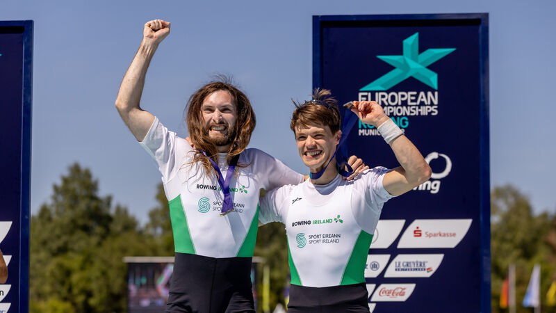 Ireland’s Paul O’Donovan and Fintan McCarthy celebrate with their gold medals after the Lightweight Double Sculls Final A at the European Championships in Munich.
