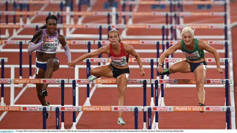 ON TRACK: Sarah Lavin of Ireland, right, during the Women's 100m Hurdles Final.
