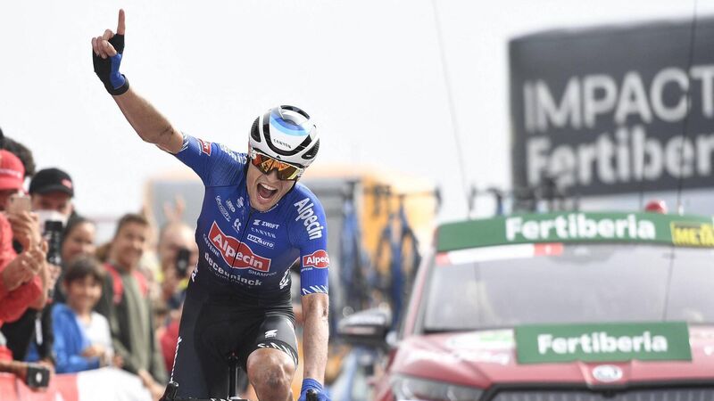SOLO WINNER: Team Alpecin-Deceuninck's Australian rider Jay Vine crosses the finish line in first place during the 8th stage of the 2022 Vuelta. Pic: Ander Gillenea/AFP via Getty Images