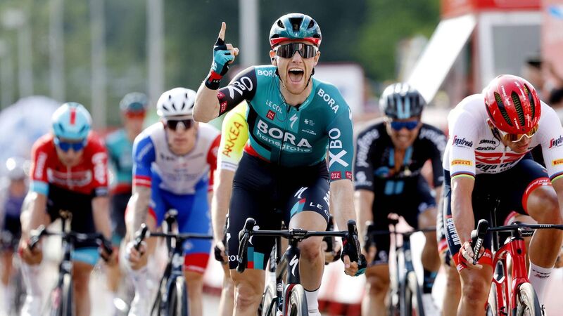 NOT TO BE: Sam Bennett celebrates winning Stage 2 of the Vuelta. The Waterford man has been forced to withdraw from the race due to Covid. Pic: Bas Czerwinski/Getty Images
