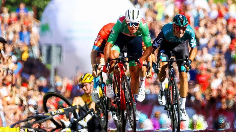 CONTRASTING FORTUNES: Mads Pedersen leads the sprint home on stage 16 of the Vuelta a España as Primoz Roglic falls in the background. Pic: David Pintens/Belga Mag/Belga/AFP via Getty Images