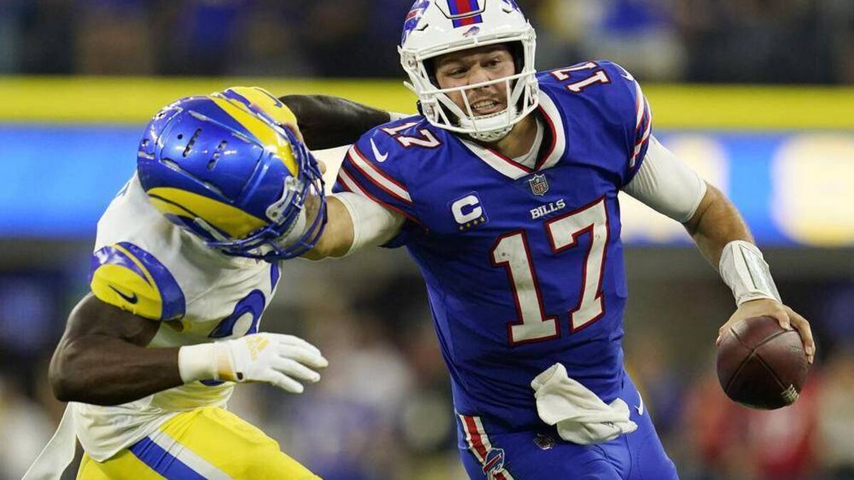ALLEN KEY: Buffalo Bills Josh Allen stiff arms LA Rams safety Nick Scott.