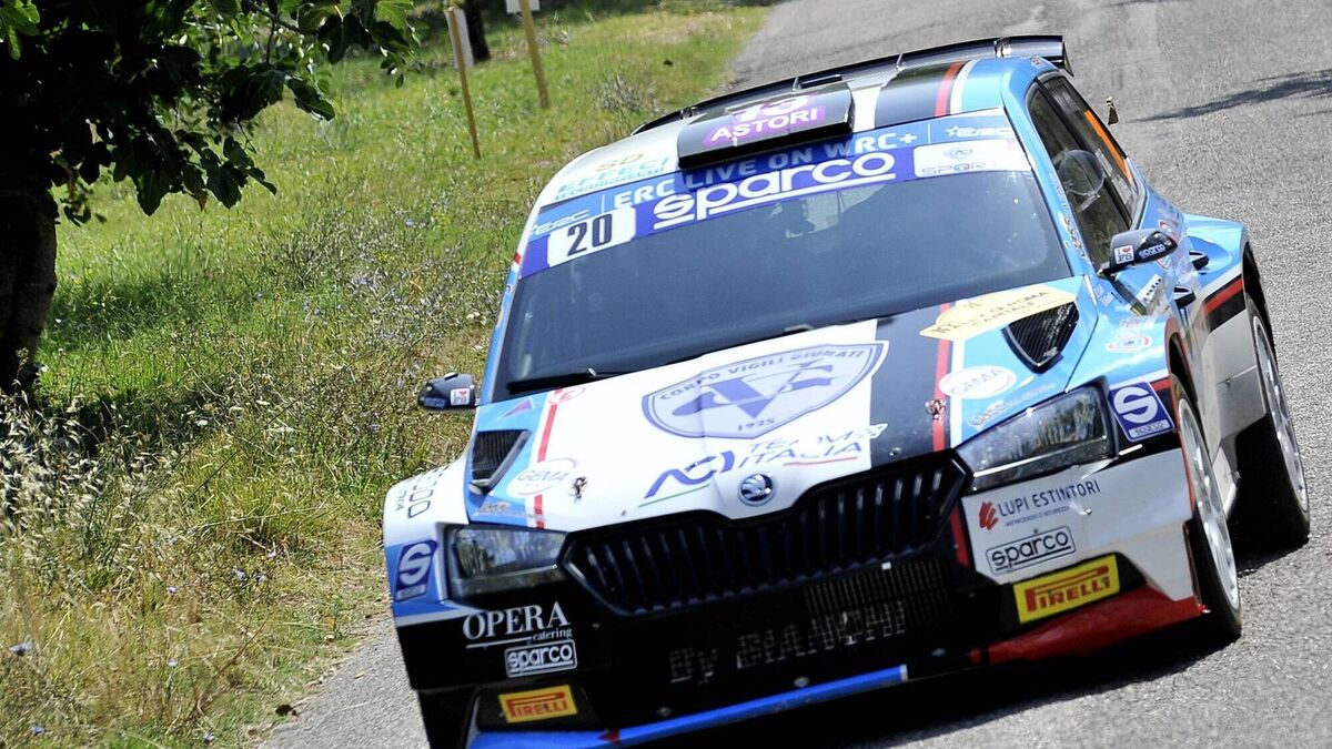 Driver Tommaso Ciuffi and his co-driver Nicola Gonella aboard their Skoda Fabia Rally 2 Evo car, during the Santopadre-Fontana Liri stage of the "Rally di Roma Capitale".