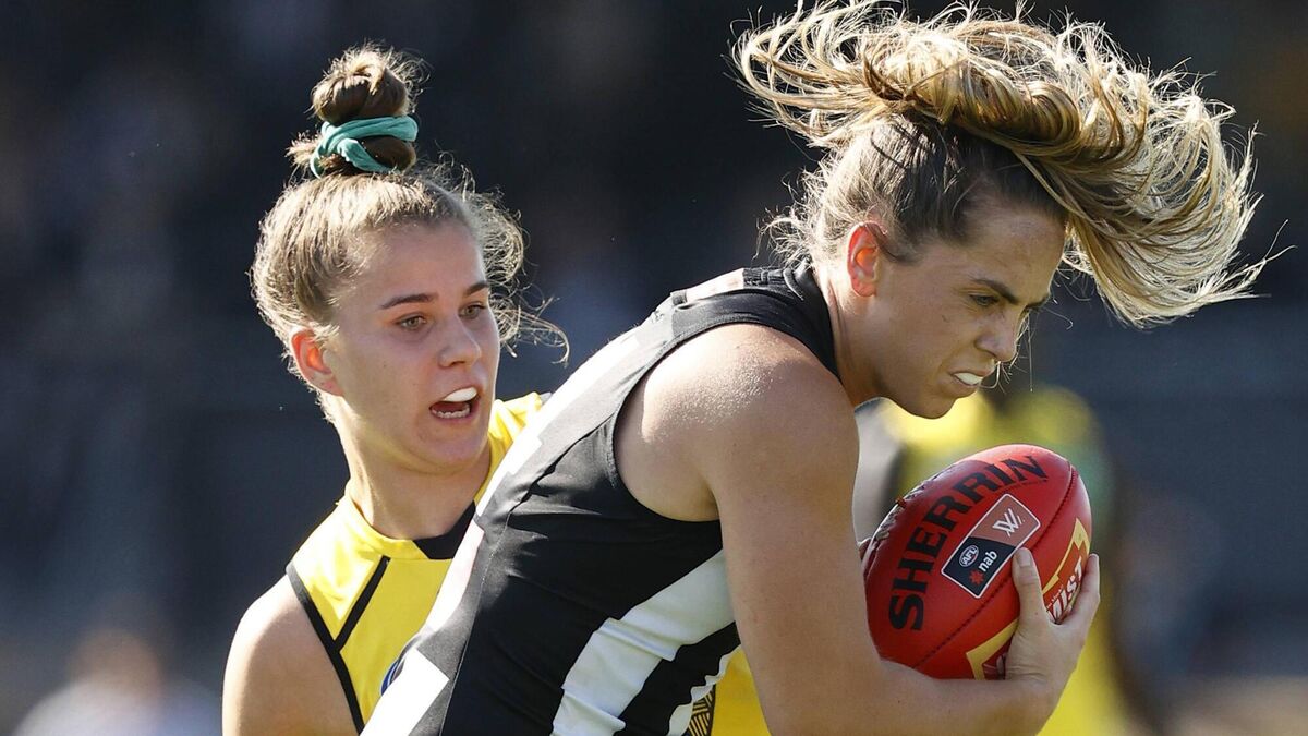 RELIEF: Aishling Sheridan of Collingwood marks the ball during the round 10 AFLW match between the Collingwood Magpies and the Richmond Tigers at Victoria Park. Pic: Darrian Traynor/Getty Images