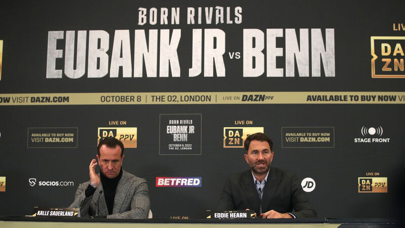 DECISION: Eddie Hearn during a press conference at the Canary Riverside Plaza Hotel London after Matchroom announced that the fight between Chris Eubank Jr and Conor Benn, which was scheduled to take place on Saturday at The O2, has been postponed.Â