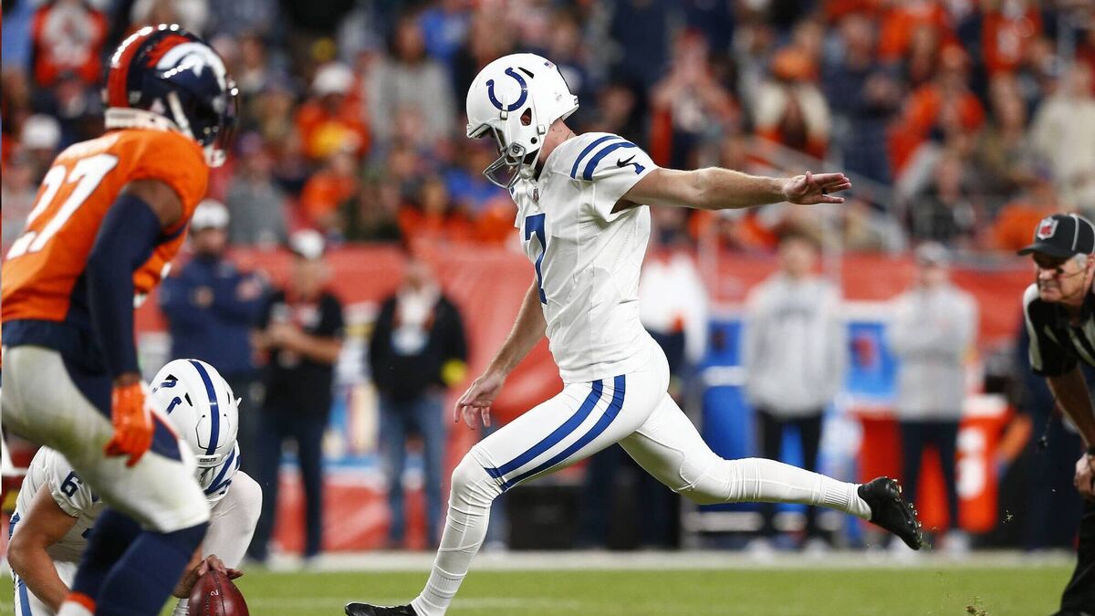 Indianapolis Colts place kicker Chase McLaughlin kicks a 48-yard field goal in overtime.