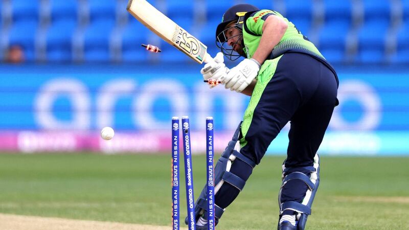 BOWLED HIM: Ireland's Captain Andrew Balbirnie is clean bowled off Sri Lanka's Lahiru Kumara during the ICC men's Twenty20 World Cup 2022 cricket match at Bellerive Oval in Hobart. Pic: David Gray/AFP via Getty Images