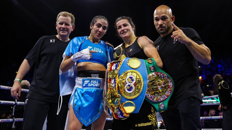 MARCHING ON: Katie Taylor celebrates with manager Brian Peters, Elizabeth Carabajal and coach Ross Enamait after retaining her Undisputed World Lightweight Championship at OVO Wembley Arena, London. Pic: INPHO/Matchroom Boxing/Mark Robinson